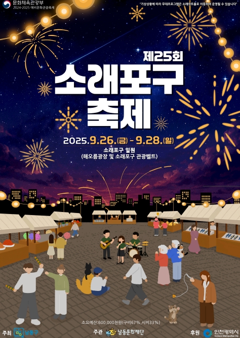[무한뉴스=정승훈 기자] 인천시 남동구와 남동문화재단은 오는 9월 26~28일까지 사흘간 열리는 ‘제25회 소래포구 축제’의 먹거리 정보를 사전에 투명하게 공개한다고 22일 밝혔다.