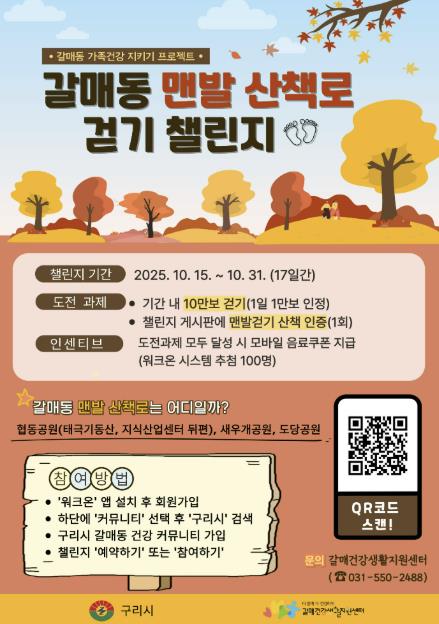 [무한뉴스=정승훈 기자] 구리시는 가을철 주민들의 건강한 생활 습관 형성과 스트레스 완화를 위해 ‘갈매동 맨발 산책로 걷기 챌린지’를 오는 10월 15일부터 31일까지 17일간 운영한다고 밝혔다.