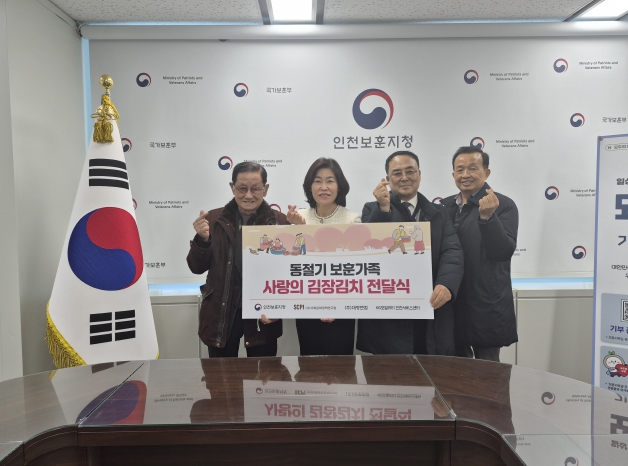 [무한뉴스=정승훈 기자] 인천보훈지청은 12월 9일 겨레홀에서 사회문화 정책연구원 등 관내 3개 후원기관과 함께 동절기 보훈가족 사랑의 김장김치(1015kg, 145가구) 전달식을 개최했다.