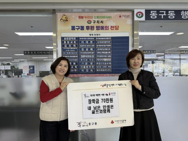 [무한뉴스=정승훈 기자] 구리시 동구동 행정복지센터는 지난 18일 동구동 행정복지센터 대회의실에서 '내 남은 인생은 골프와 함께' 모임으로부터 관내 취약계층 청소년을 위한 장학금 70만 원을 기탁받았다고 밝혔다.