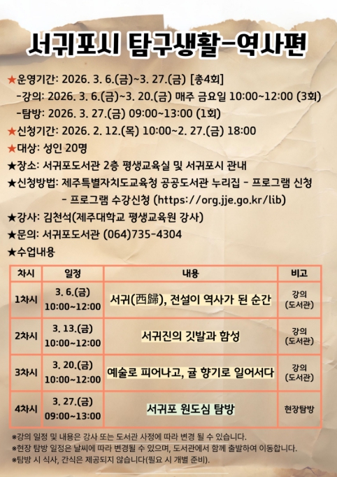 이번 1분기 프로그램인 ‘서귀포시 탐구생활–역사편’은 김천석 제주대학교 평생교육원 강사의 지도로 총 4회 과정으로 운영되며 옛 기록 속 서귀포의 역사와 원도심에 남겨진 예술인의 삶을 심도 있게 살펴볼 예정이다.