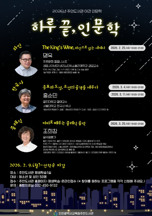 [무한뉴스=정승훈 기자] 인천광역시교육청주안도서관은 2월부터 3월까지 시민들이 다양한 인문학 주제를 접할 수 있는 야간 인문학 프로그램 ‘하루 끝, 인문학’을 운영한다.
