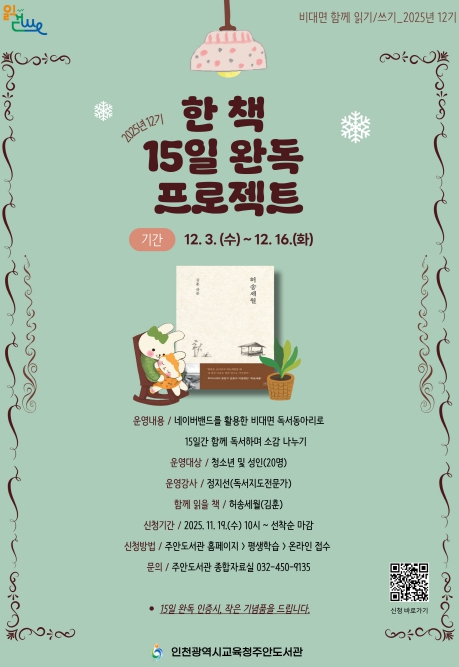 [무한뉴스=정승훈 기자] 인천광역시교육청주안도서관은 11월 19일 오전 10시부터 ‘12기 비대면 함께 읽기-한 책 15일 완독 프로젝트’ 참여자를 모집한다.