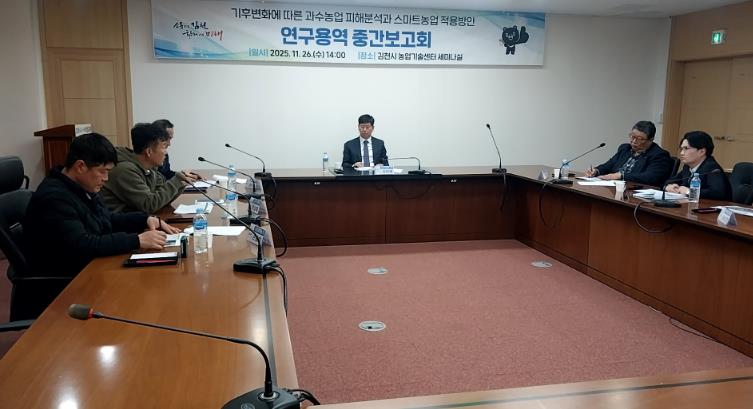 [무한뉴스=최진수 기자] 김천시는 지난 11월 26일, 기후변화에 따른 과수 농업 피해 분석과 스마트농업 적용 방안 연구용역 중간 보고회를 개최했다.