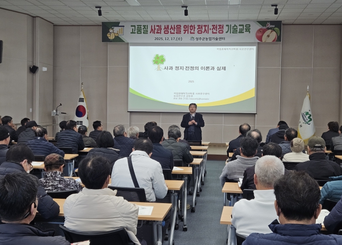[무한뉴스=최진수 기자] 성주군은 12월 17일, 농업기술센터 2층 대강당에서 관내 사과재배 농가 100여명을 대상으로『고품질 사과 생산을 위한 정지·전정 기술교육』을 실시했다.