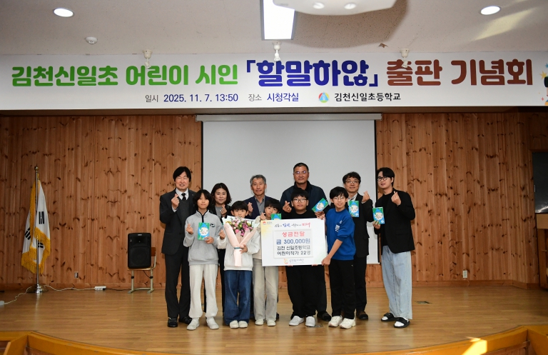 [무한뉴스=최진수 기자] 김천복지재단(이사장 배낙호)은 지난 7일, 김천 신일초등학교(교장 채득원) 어린이 작가 22명으로부터 시집 『할말하않』 출판 수익금 성금 30만 원을 전달받았다고 밝혔다.