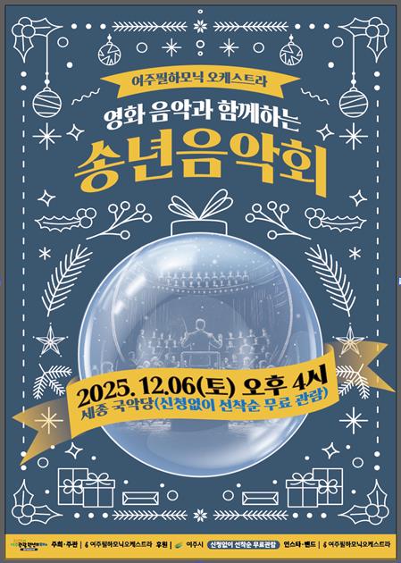[무한뉴스=정충근 기자] 여주 필하모닉 오케스트라는 오는 12월 6일 오후 4시, 세종국악당에서 '영화 음악과 함께하는 2025 송년음악회'라는 주제로, 연말을 맞아 여주시민과 함께 영화 속 명장면을 음악으로 되살리는 특별한 무대를 준비한다.