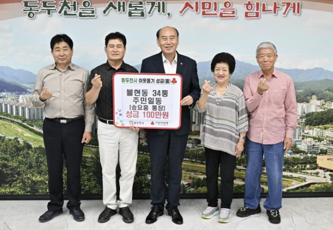 [무한뉴스=정승훈 기자] 동두천시 불현동 34통 주민일동은 9월 25일 동두천시청을 방문해 지역 내 저소득 가정을 돕기 위한 성금 100만 원을 기탁했다.
