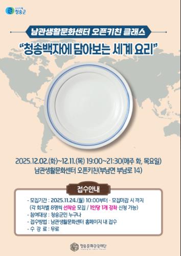 [무한뉴스=최진수 기자] (재)청송문화관광재단은 지역 대표 문화유산인 청송백자에 세계 각국의 음식을 직접 만들어 담아보는 체험형 요리 수업 ‘청송백자에 담아보는 세계 요리’를 오는 12월 2일부터 11일까지 매주 화·목 저녁 7시부터 9시 30분까지 남관생활문화센터 오픈키친에서 총 4회 운영한다고 밝혔다.