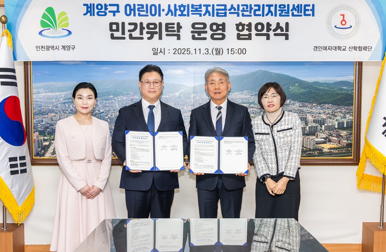 [무한뉴스=정승훈 기자] 인천광역시 계양구는 11월 3일 경인여자대학교 산학협력단과 계양구 어린이·사회복지급식관리지원센터 민간위탁 운영 협약을 체결했다.