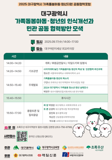[무한뉴스=정승훈 기자] 대구시교육청은 9월 17일 오후 2시, 대구어린이세상 꾀꼬리극장에서 가족돌봄아동·청년지원 공동협력포럼을 개최한다.