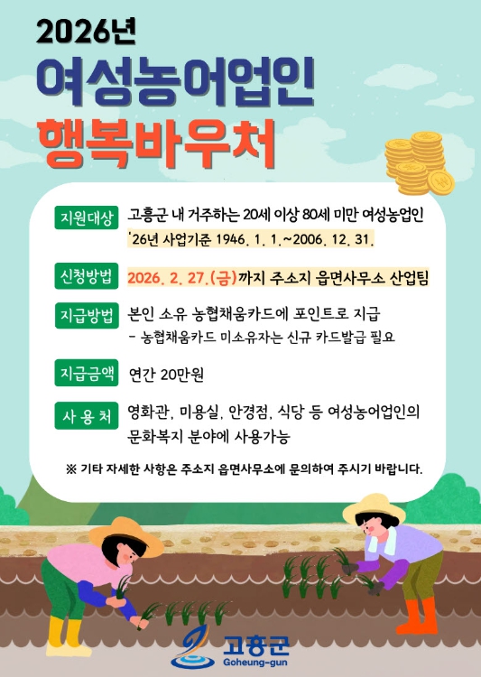 [무한뉴스=정민정 기자] 고흥군은 여성 농어업인의 문화·여가 활동을 돕기 위해 ‘2026년 여성농어업인 행복바우처 지원사업’ 신청을 오는 2월 27일까지 주소지 읍·면사무소에서 접수한다고 밝혔다.