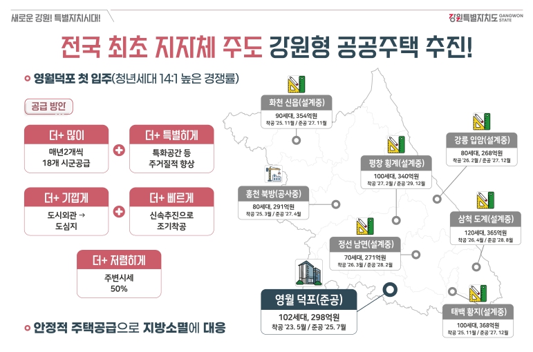 [무한뉴스=정민정 기자] 강원특별자치도는 청년과 신혼부부 등 지역 정착 인구 확대를 위한 안정적인 주택공급을 목표로 전국 최초의 지자체 주도형 주거모델인 강원형 공공주택 사업을 적극 추진하고 있다고 밝혔다.