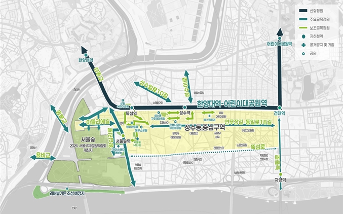 선형정원 네크워크는 주요 간선도로인 왕십리로, 아차산로, 능동로 등 주요노선 6.5km 구간과 ‘감성과 트렌드’가 공존하는 성수동 연무장길 등 주요 골목길 3.5km 구간을 포함해 주요 간선도로와 골목길을 접한 성수동과 자양동 일대 공원 및 광장, 자투리 공간 등 3만㎡이다.