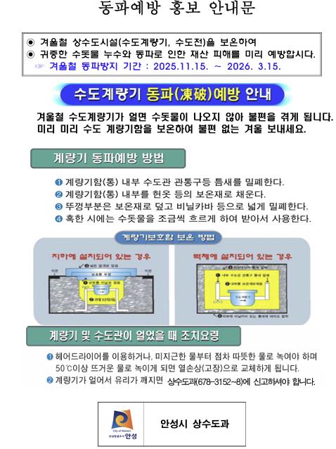 | ▲ 안성시, 동절기 급수공사 중지 예고 및 계량기 동파 방지 안내 |