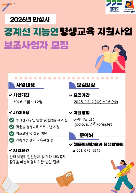 [무한뉴스=정충근 기자] 안성시는 관내 경계선 지능인의 진단·학습·가족 지원을 체계화하고 포용적 학습환경을 조성하기 위해 12월 2일부터 16일까지'2026년 경계선 지능인 평생교육 지원사업'을 수행할 보조사업자를 공모한다.