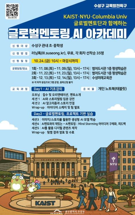 [무한뉴스=최진수 기자] 대구 수성구는 오는 11월 7일 범어도서관 김만용·박수년홀에서 ‘글로벌 교육 전문가와 함께하는 수성 AI 인재 미래교육 포럼’을 개최하고, 연계 프로그램인 AI 아카데미를 통해 미래세대를 위한 교육혁신과 글로벌 협력의 출발점을 연다.