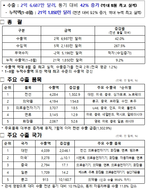 올해 1~8월 누적 수출액은 21억 1,850만 달러로 집계되어 역대 최고치를 경신했다.