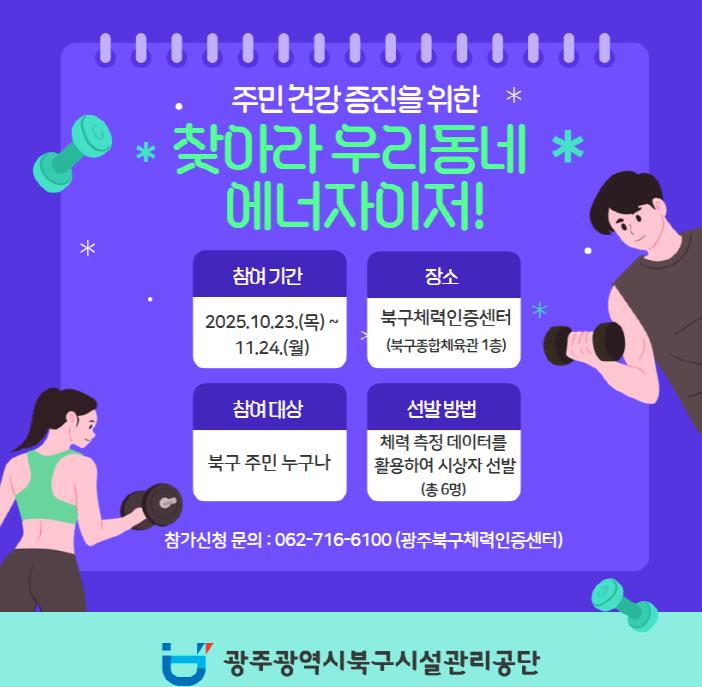 [무한뉴스=정민정 기자] 광주광역시북구시설관리공단은 지역 주민들의 체력 증진과 건강한 생활 습관 형성을 위해 ‘찾아라 우리동네 에너자이저!’ 2기 선발대회를 개최한다고 밝혔다.