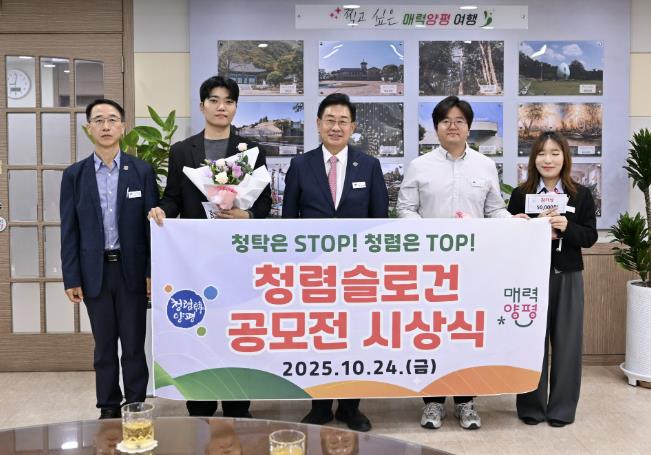 [무한뉴스=정승훈 기자] 양평군은 지난 24일 ‘2025 청렴 슬로건 시상식’을 개최하고, 공정하고 투명한 공직문화 확산을 위해 추진한 ‘청렴 슬로건 공모전’의 수상작을 발표했다.
