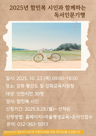 [무한뉴스=정승훈 기자] 인천광역시교육청신트리도서관은 10월 23일 인천시민을 대상으로 ‘함민복 시인과 함께하는 독서인문기행’을 운영한다.