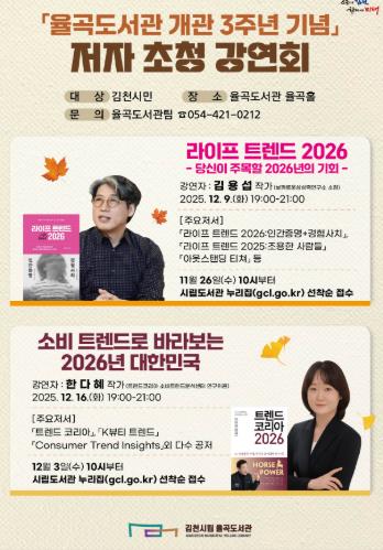 [무한뉴스=최진수 기자] 김천시립 율곡도서관은 개관 3주년을 맞아 오는 12월 국내 대표 트렌드 전문가를 초청해 강연회를 개최하고, 참가자를 모집한다.