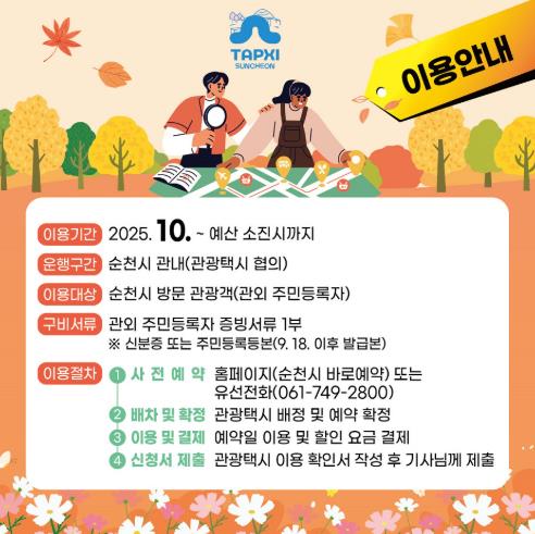 [무한뉴스=정민정 기자] 순천시는 10월부터 순천 관광택시 ‘가을맞이 반값 할인 이벤트’를 진행한다고 밝혔다.