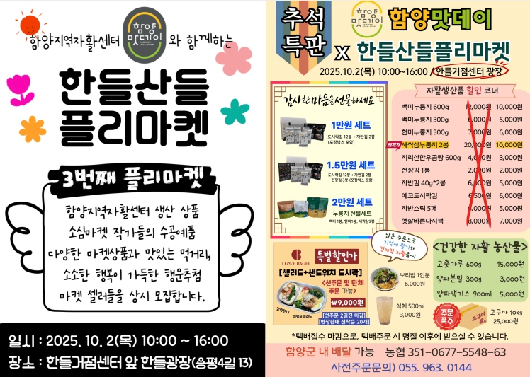 [무한뉴스=최진수 기자] 함양군은 10월 2일 오전 10시부터 오후 4시까지 한들거점센터 앞 한들광장에서 ‘한들산들 플리마켓’ 3회차 행사를 개최한다.