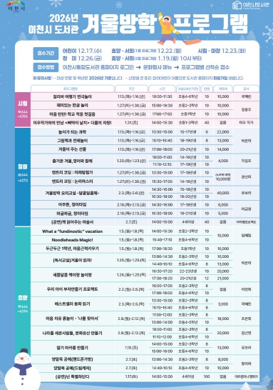[무한뉴스=정충근 기자] 이천시는 2026년 1월부터 2월까지 겨울방학 기간에 어린이를 대상으로 한 다양한 독서문화 프로그램을 운영한다고 밝혔다.