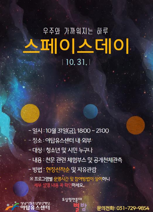 [무한뉴스=양현명 기자] 성남시청소년청년재단 야탑유스센터는 10월 31일 오후 6시부터 9시까지 청소년과 시민을 대상으로 우주·천문을 주제로 행사 ‘스페이스데이(SPACE DAY)’를 연다고 밝혔다.