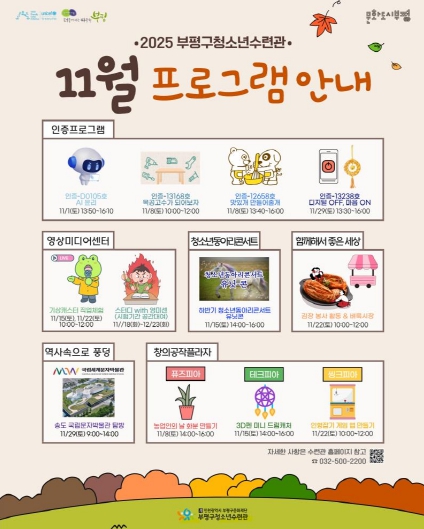 [무한뉴스=정승훈 기자] 부평구 청소년수련관은 11월에도 다채로운 체험형·진로탐색형 프로그램을 운영한다고 밝혔다.