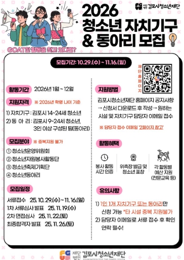 [무한뉴스=정승훈 기자] (재)김포시청소년재단에서 2026년 한 해 동안 김포시 청소년 수련시설을 함께 이끌어갈 청소년 자치기구 및 동아리 참여 청소년을 오는 10월 29일부터 11월 16일까지 모집한다.