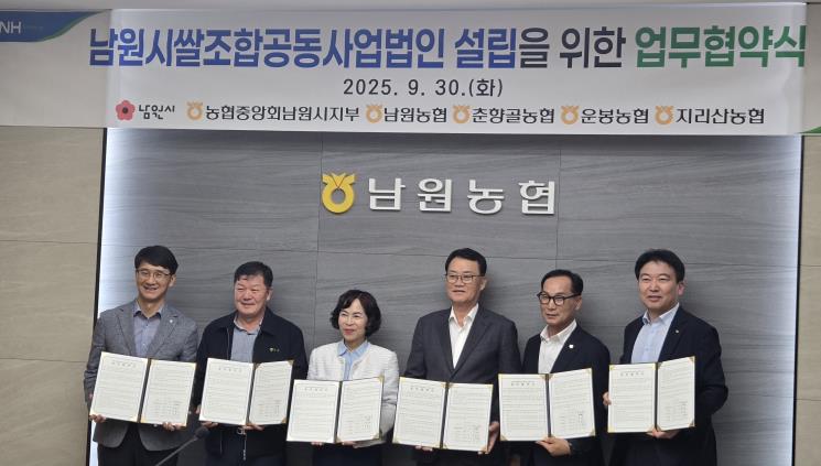 [무한뉴스=정민정 기자] 남원시는 이번 9월 30일 남원농협에서 농협쌀조합공동사업법인 설립을 위해 남원시(남원시농업기술센터소장), 농협중앙회남원시지부, 남원농협, 춘향골농협, 운봉농협, 지리산농협과 업무협약식을 개최했다.