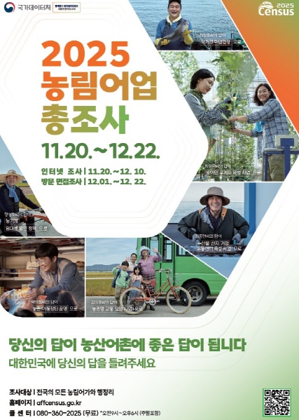[무한뉴스=정충근 기자] 국가데이터처(구 통계청)이 주관하고 전국 지자체가 시행하는 '2025 농림어업총조사'를 안성시에서 실시한다. 농림어업총조사는 5년 주기로 실시하는 전수조사로 인터넷조사는 11월 20일부터, 방문면접조사는 12월 1일에 시작할 예정이다.