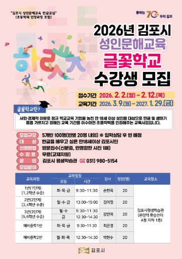 [무한뉴스=정승훈 기자] 김포시는 배움에 대한 열정을 다시 시작하고자 하는 시민을 대상으로 2026년 성인문해교육 ‘글꽃학교’ 수강생을 2월 2일부터 2월 12일까지 모집한다고 밝혔다.