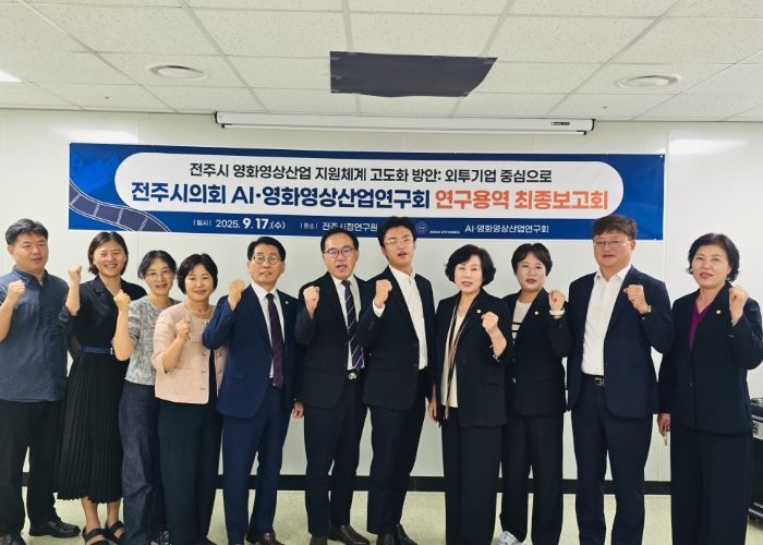 [무한뉴스=정민정 기자] 전주시의회는 지난 17일 의원 연구단체인 AI·영화영상산업연구회가 전주시정연구원에서 연구용역 최종보고회를 열고, 글로벌 영화사 유치 전략에 대해 논의했다고 18일 밝혔다.