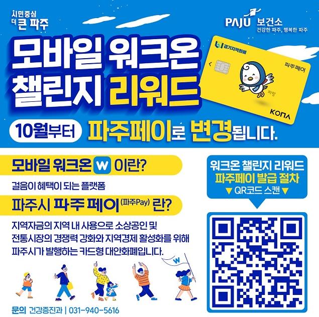그동안 ‘워크온 걷기 챌린지’ 보상은 모바일 상품권 등으로 제공됐으나, 앞으로는 시민들이 파주시 전역에서 자유롭게 사용할 수 있는 파주페이로 지급된다.