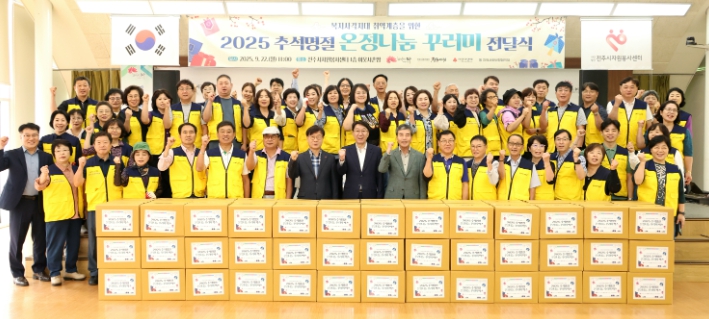 전주시복지재단(이사장 윤방섭)은 22일 전주시자원봉사센터에서 우범기 전주시장과 한명규 전북사회복지공동모금회 회장, 전주시 동 지역사회보장협의체(회장 전석진) 위원 등 80여 명이 참석한 가운데 ‘2025 추석명절 온정나눔 꾸러미’ 행사를 가졌다.