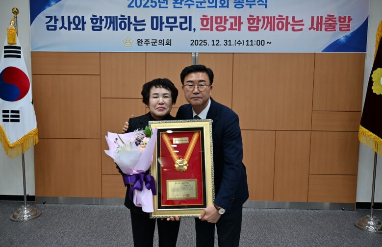 [무한뉴스=정민정 기자] 완주군의회 이경애 의원이 지난달 31일, 완주군의회 문화강좌실에서 열린 완주군의회 2025년도 종무식에서 전북 지방의정봉사상을 수상했다.