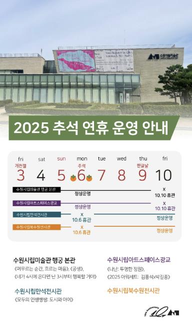 수원시립만석전시관과 수원시립북수원전시관은 추석 당일인 10월 6일(월)만 휴관한다. 김지은, 김참새 작가가 참여해 일상적 도시 환경을 새로운 시선으로 관찰하는 참여형 교육 전시 《모두의 인쌩쌩쌩: 도시와 아이》와대관전시《채운민화연구회》, 《강숙란》, 《윤홍주》, 《이연준》전을 관람할 수 있다.