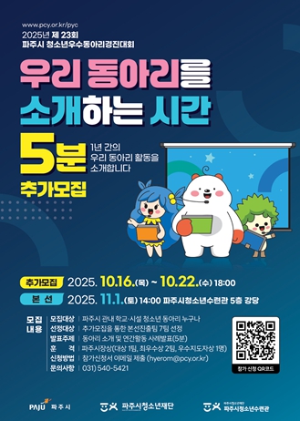 [무한뉴스=정승훈 기자] (재)파주시청소년재단 파주시청소년수련관은 오는 10월 16일부터 10월 22일까지 “제23회 파주시 청소년우수동아리경진대회”의 참가 동아리를 모집한다.