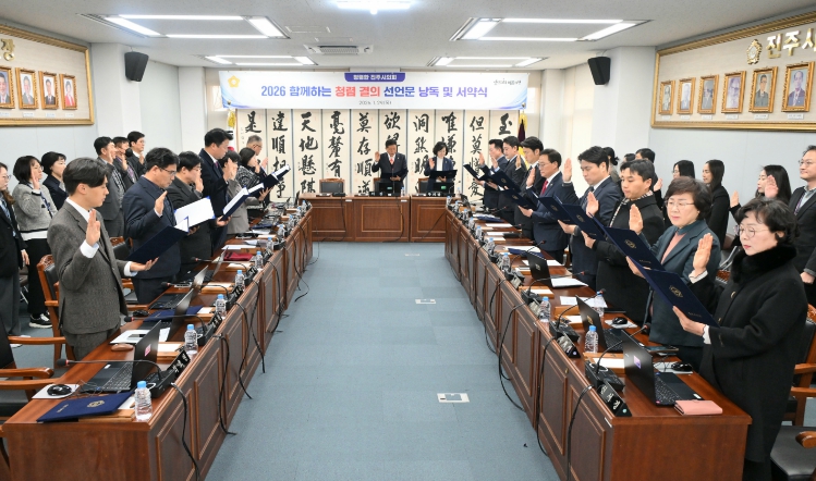 [무한뉴스=양현명 기자] 진주시의회는 29일 제271회 임시회를 앞두고 청렴한 의정 실천을 위한‘2026 함께하는 청렴결의 선언문 낭독 및 서약식’을 개최했다.