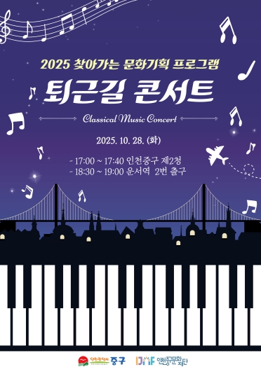 [무한뉴스=정승훈 기자] (재)인천중구문화재단(이사장 김정헌)은 오는 28일 저녁 퇴근길 시민들을 위한 특별한 문화 행사 ‘2025 영종 퇴근길 콘서트’를 개최한다.