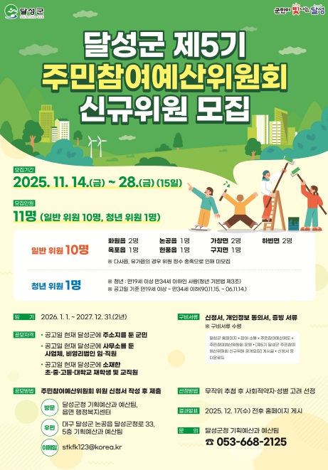 [무한뉴스=최진수 기자] 달성군은 11월 14일부터 28일까지 제5기 주민참여예산위원회 신규위원 11명을 모집한다.