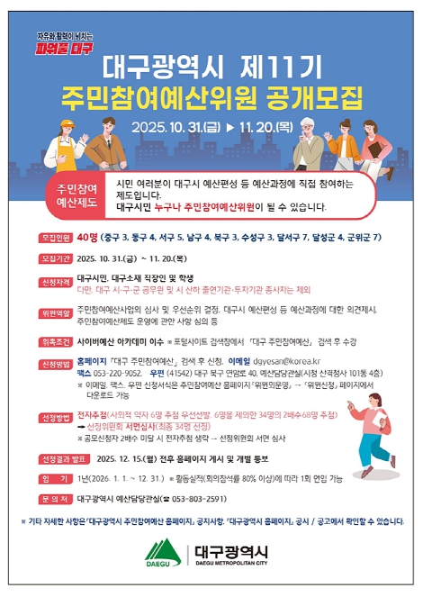 [무한뉴스=최진수 기자] 대구광역시는 2026년 주민참여예산제 운영에 참여할 제11기 주민참여예산위원 40명을 공개 모집한다.