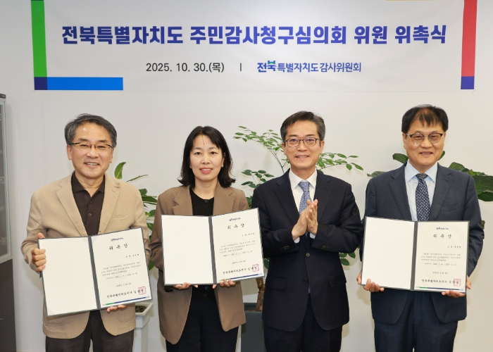 [무한뉴스=정민정 기자] 전북특별자치도는 공정하고 투명한 행정 실현을 위해 주민감사청구심의회 민간 위원 4명을 위촉했다고 30일 밝혔다.
