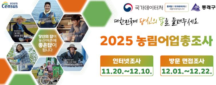 [무한뉴스=최진수 기자] 부산 동래구는 11월 20일부터 12월 22일까지 33일간 ‘2025 농림어업총조사’를 실시한다고 밝혔다.