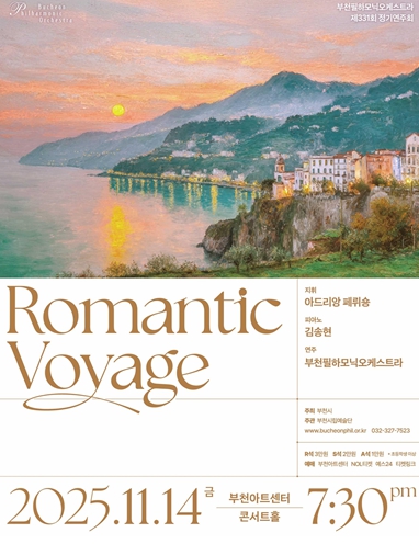 [무한뉴스=정승훈 기자] 부천필하모닉오케스트라가 오는 11월 14일 오후 7시 30분 부천아트센터 콘서트홀에서 제331회 정기연주회 'Romantic Voyage'를 개최한다. 공연에는 상임지휘자 아드리앙 페뤼숑과 부천필이 무대에 오르며, 협연자로는 탁월한 음악적 이해력과 구성력으로 호평받는 피아니스트 김송현이 ‘낭만적 여정’에 함께 오른다.