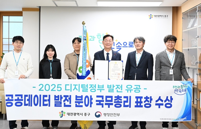 [무한뉴스=정민정 기자] 대전 중구는‘2025 디지털정부 발전 유공 정부포상’공공데이터 발전 부문에서 전국 기초자치단체 중 유일하게 국무총리 기관 표창을 수상했다고 4일 밝혔다.