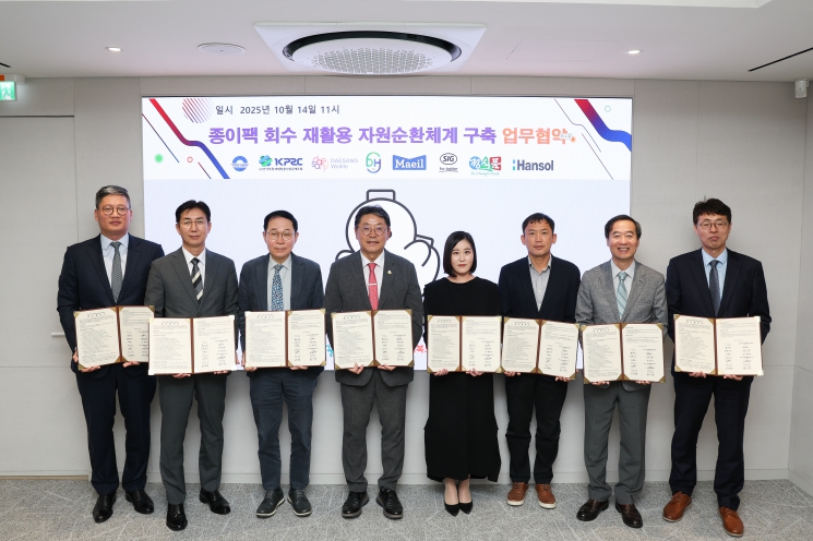 참여 기업은 (사)한국포장재재활용사업공제조합(이사장 김동진), 대상웰라이프(주)(대표이사 서훈교), ㈜대흥리사이클링(대표이사 박혜란), ㈜매일유업(대표이사 이인기), 에스아이지콤비블록코리아(주)(사장 조명현), ㈜정식품(대표이사 정연호), 한솔제지(주)(대표이사 한경록)로 종이팩 수거·분리배출 홍보·사용 확대·보상 프로그램 운영·친환경 제품 생산 등 각자의 역할에서 협력을 다짐했다.